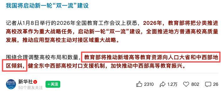 这7所双非高校皆是位于中西部地区和东谈主口大省,辅导部此前还是明确说过:2026年将鼓吹新增高档辅导资源向东谈主口大省和中西部地区歪斜。