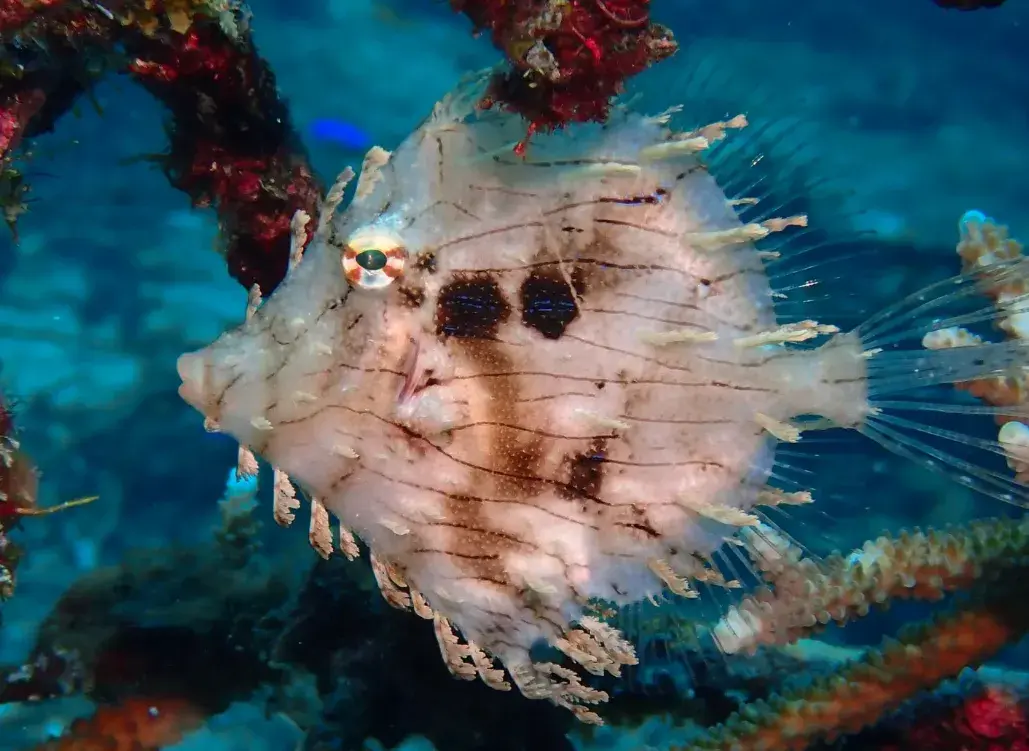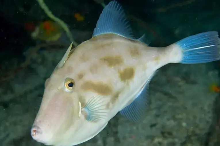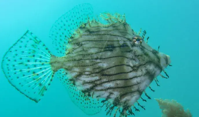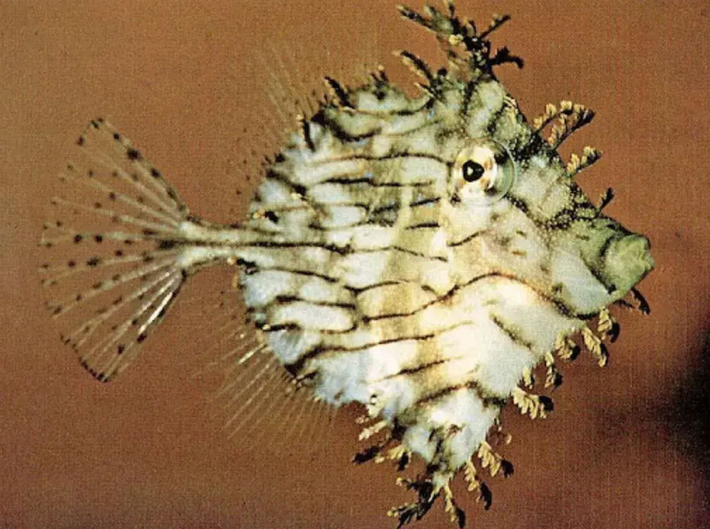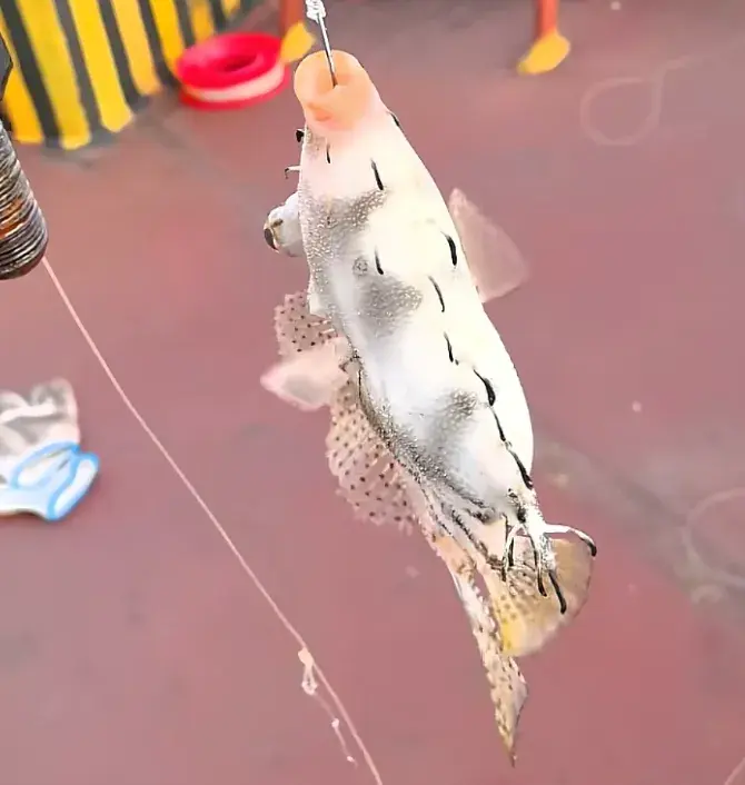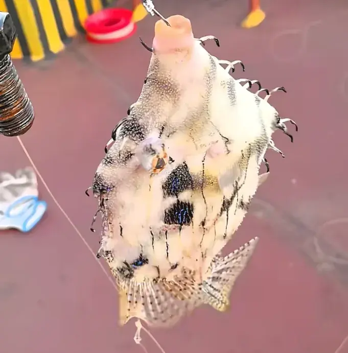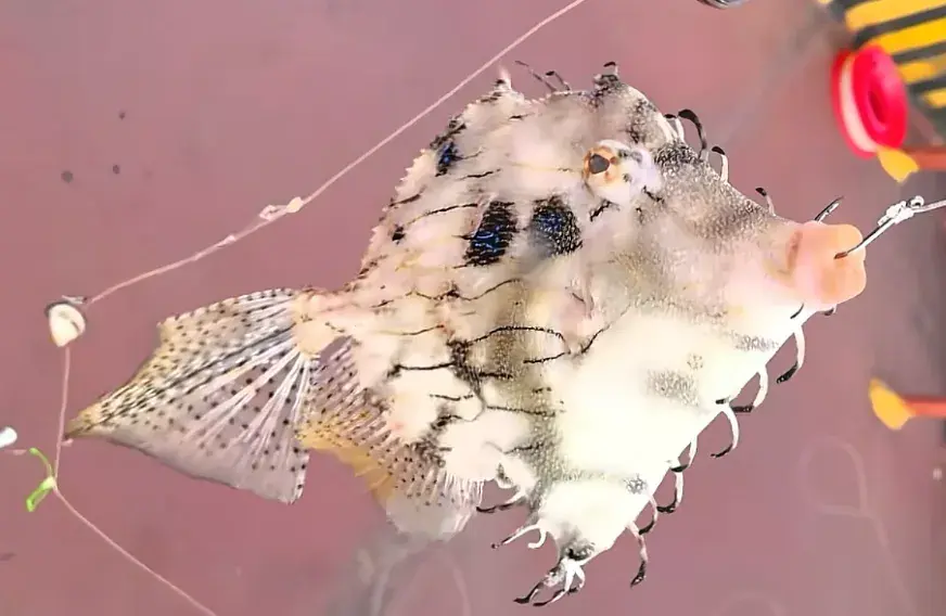 但这条鱼外形跟剥皮鱼的互异更是彰着。其体色是灰白色的,上头有好多不规则的细黑纹,眼睛周围还有辐照状的细黑纹,眼后和胸鳍上方都有一个大黑圆斑;躯壳也不像剥皮鱼那些长,会更短,全体概述是卵圆形的;最让东谈主真贵的是它身上有额外多形似鱼钩的突起,突起的终端依然玄色的;各鱼鳍都是透明带点黄色的,然后上头好多玄色细点。