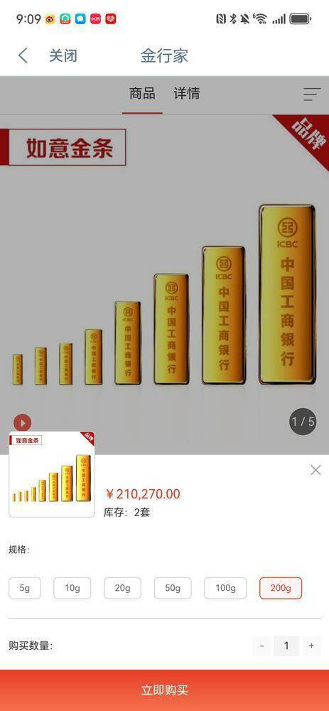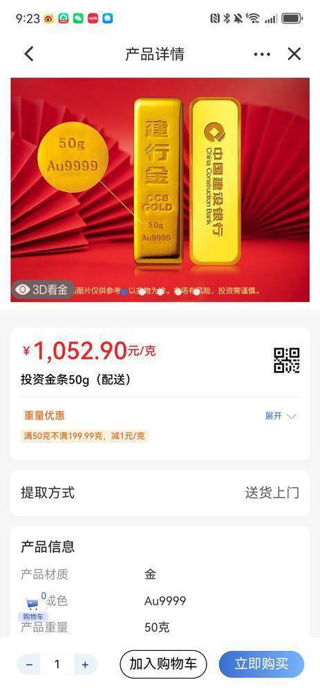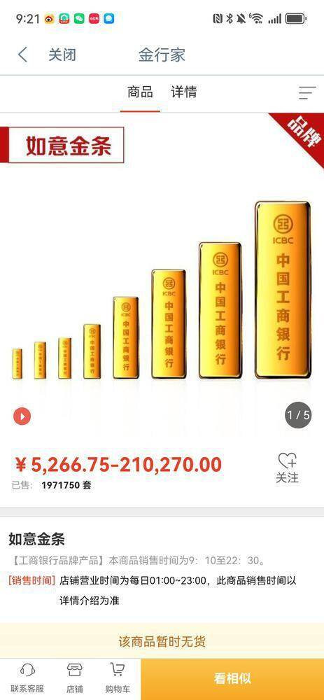羊城晚报全媒体记者第一时分登录几家国有银行APP发现,小克重的金条照实“一金难求”,以建行APP为例,当今仍然粗略购买的最小克重位50g,及时价钱位1052.9元/g。而工行在记者第一次掀开时仍然显现从5g到200g的金条仍然不错用少许不错购买,其中200g的金条总价约为21万多,还有两套不错选购,然则不到半小时后,其APP上显现也曾通盘售罄,所有这个词什物黄金页面显现“该商品暂时无货”。