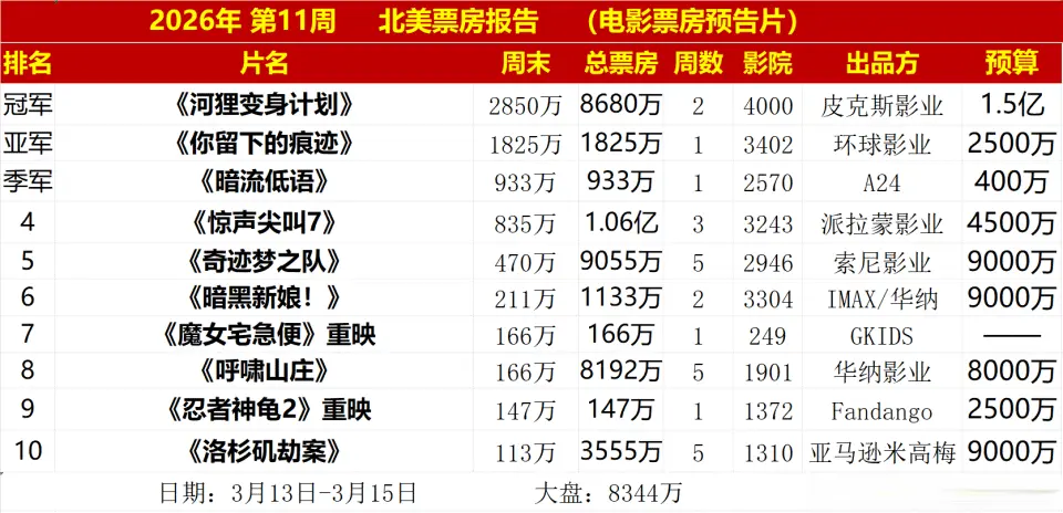 2026年第11周,3月13日至15日,北好意思大盘认为轰下8244万,环比第10周下落了12%。票房前三甲区别为《河狸变身盘算》、《你留住的陈迹》和《暗潮低语》。