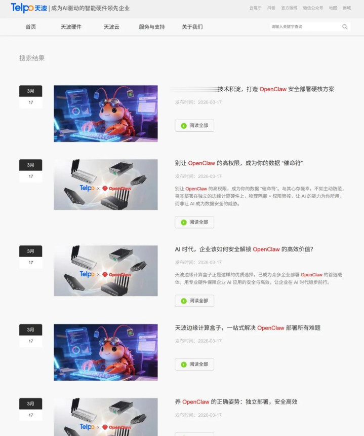 从2026年3月中旬运转,跟着“养龙虾”热的束缚升温,天波科技官方网站就运转连气儿发布多篇相关OpenClaw硬件部署内容的著作,如《养“龙虾”选对载体才不踩坑,边际规划盒子成OpenClaw最优解》、《养龙虾=企业提效?OpenClaw六大办公场景+边际盒子安一齐署攻略》、《一文读懂!OpenClaw部署在边际规划盒子上有什么硬件配置要求?》、《天波科技:20 年时刻积淀,打造 OpenClaw 安一齐署硬核决策》等,内容主要全面将本人时刻和居品与“养龙虾热”嫁接。