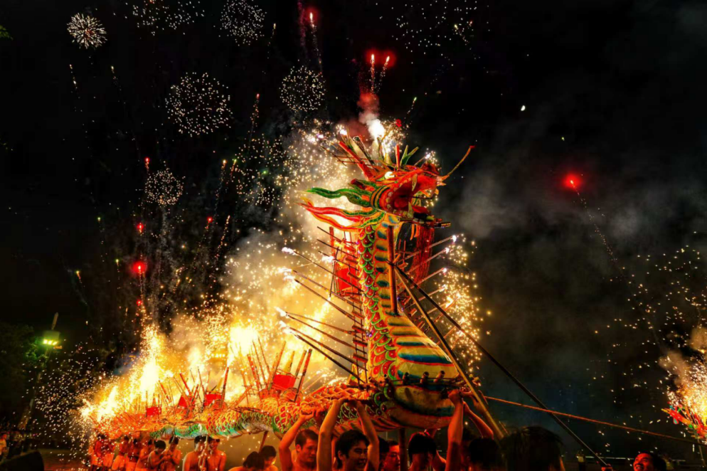 当夜幕来临,灼热的星雨便点亮了梅江两岸。国度级非遗埔寨火龙惊艳亮相,饰演者赤膊上阵,高擎龙头,摆动龙身,扭捏龙尾,鱼虾穿梭其间,烟花开放、火箭四射,在侵扰鼎沸中祈愿祥和祥瑞、岁岁安静,设置一场视觉、听觉与心灵的三重颠簸。