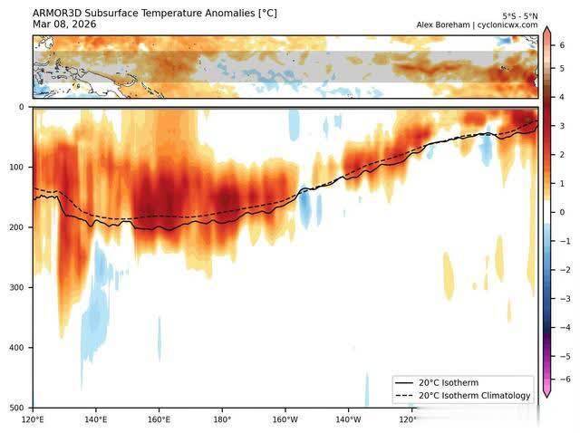 从2026年3月8日的次上层剖面图不错明晰地不雅察到,在赤谈太平洋120°E至80°W的繁多海域下,深度约50至200米之间,巨大的红色色块实在填满了通盘这个词监测区间。这些代表正距平(即温度高于终年同时)的暖水,其中枢区域的温度偏高幅度居然达到了4°C至6°C以上。