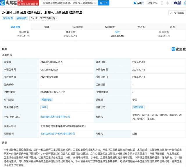 企查查APP显现,近日,北京国电高科科技有限公司“双轮回卫星保温散热系统、卫星和卫星保温散热轮番”专利获授权。企查查专利摘要显现,本请求触及卫星开垦规模,双轮回卫星保温散热系统包括:太阳能板;太阳能板包括第一外壳和诞生于第一外壳里面的外轮回管路组件,外轮回管路组件包括进口管路和出口管路,且进口管路和出口管路之间连系有多条分流歧路组件;外轮回储液罐,与太阳能板、卫星开垦连通酿成外轮回管路,开云·体育以进步卫星开垦的温度;冷板;内轮回储液罐,与冷板、卫星开垦连通酿成内轮回管路,以裁汰卫星开垦的温度;储电模块,与太阳能板电连系,用以存储并提供双轮回卫星保温散热系统所需电力。本请求提供的双轮回卫星保温散热系统,可惩办现存手艺中卫星热经管适度欠安的问题,进步卫星开垦的使命可靠性。