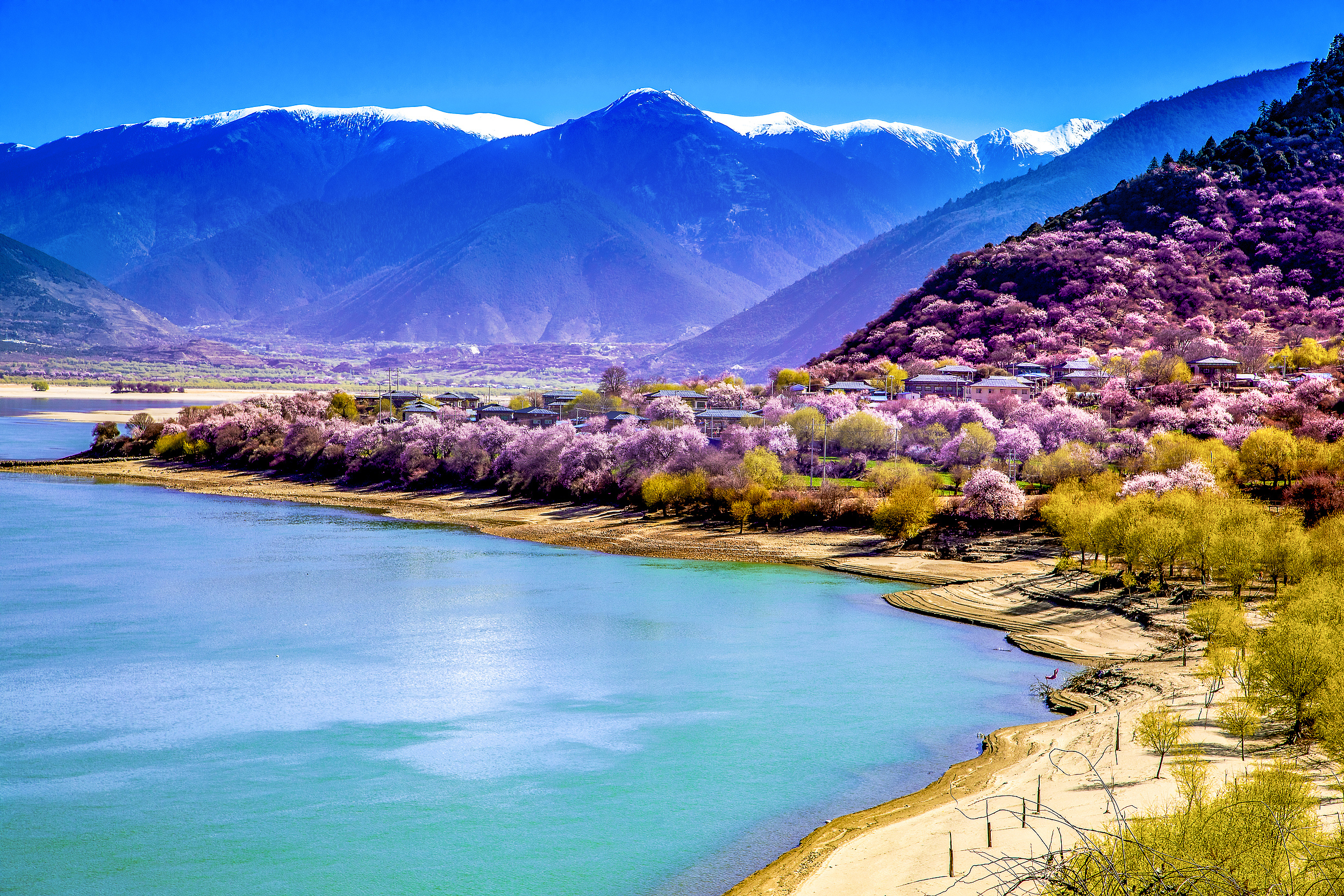 谁懂啊!3月的林芝,漫天遍野的高郊外桃花,王人备不似江南褭褭婷婷的娇柔,林芝的桃花树高花繁,开得壮阔又纵情,光溜溜的枝干上缀满粉白花瓣,背后是皎洁雪山、解析溪流,还有杂沓的藏式屯子,顺手一拍都是大片。