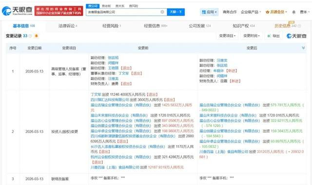 天眼查工商信息骄横,近日,吉香居食物有限公司发生工商变更,独创东谈主丁文军卸任法定代表东谈主、董事长兼总司理,徐陈俩接任法定代表东谈主,周志毅接任董事长。同期,原鼓吹丁文军、四川骐汇达科技有限公司等退出,吉香居的公司类型也已由“股份有限公司”相应变更为“有限包袱公司”。