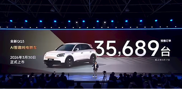 快科技3月19日音讯,在昨晚的“2026奇瑞汽车电板之夜”上,奇瑞官宣旗下全新纯电轿车QQ3 EV预售订单达到35689台(完了本月17日),并将于本月30日崇敬上市。