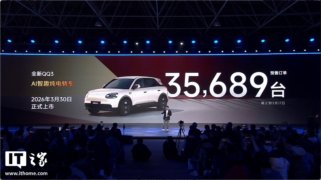 IT之家 3 月 18 日音书,在今晚的 2026 奇瑞汽车电板之夜上,奇瑞晓示奇瑞 QQ3 将于 3 月 30 日上市,该车已于 3 月 10 日开启预售,预售价区间为 6.8920 万 -8.9985 万元,共推出 310km 和 420km 两种续航版块的四款车型。甘休 3 月 17 日,该车预售订单已达 35,689 台。