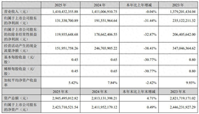 2026 年 3 月,濮阳惠成电子材料股份有限公司(股票简称:濮阳惠成,股票代码:300481)发布 2025 年年度论述。论述裸露,公司全年终了交易收入 14.10 亿元,较上年微降 0.04%;包摄于上市公司股东的净利润 1.31 亿元,包摄于上市公司股东的扣除非浮浅性损益的净利润 1.20 亿元;基本每股收益 0.45 元。尽管面对行业竞争加重等挑战,公司凭借中枢居品上风与工夫翻新实力,保持了操办的悠闲性,同期在产能延伸、市集拓展等方面取得积极发达。